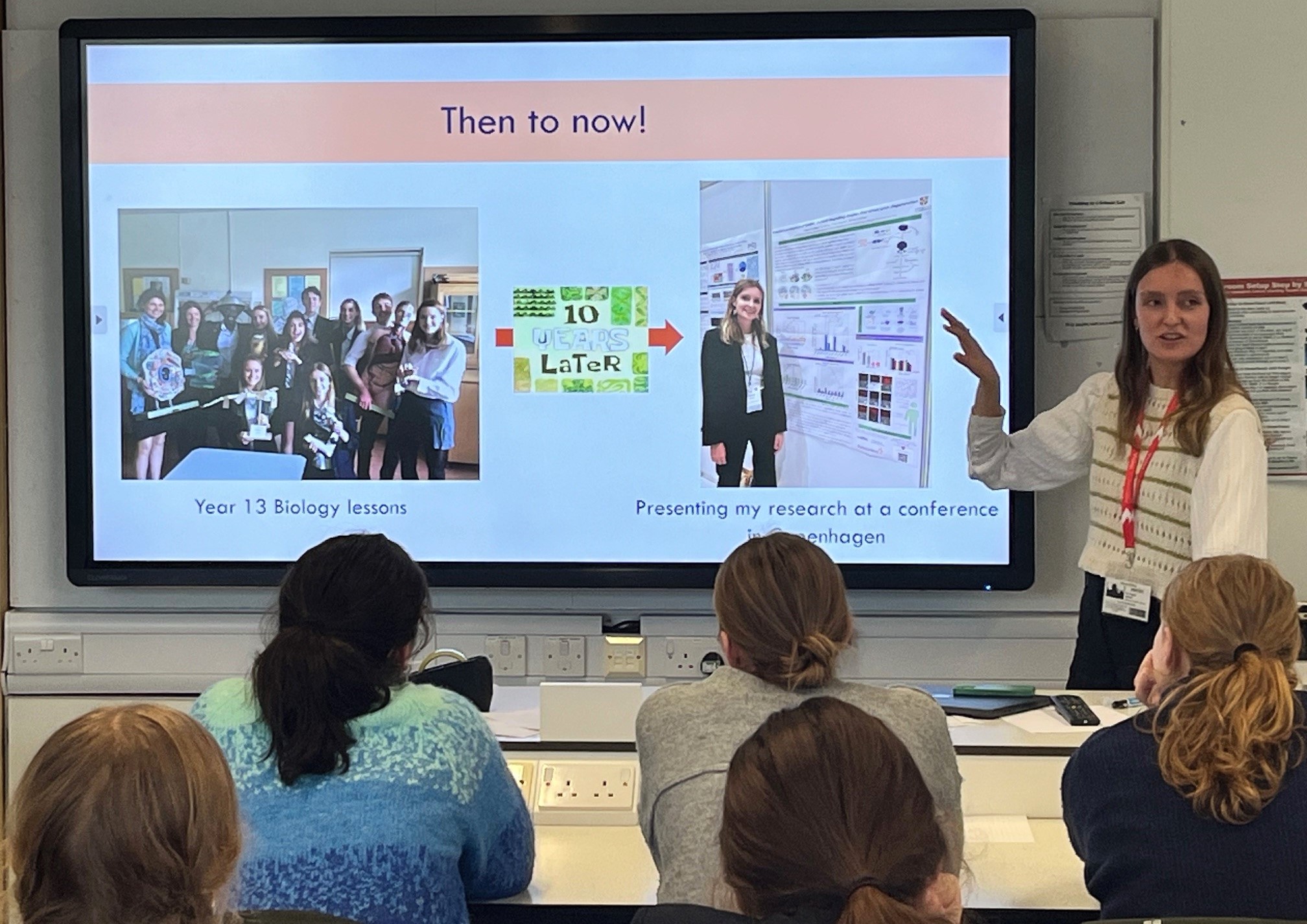The students were fascinated to learn what life as a researcher really looks like. Ella described her typical weekly routine, which includes conducting lab experiments, analysing data, teaching Natural Sciences undergraduates, attending meetings, and writing and presenting scientific papers.